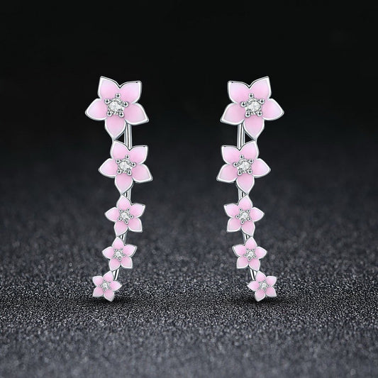PAHALA 925 Sterling Silver Cherry Flower Pink Enamel Crystal Long Tassel Earrings