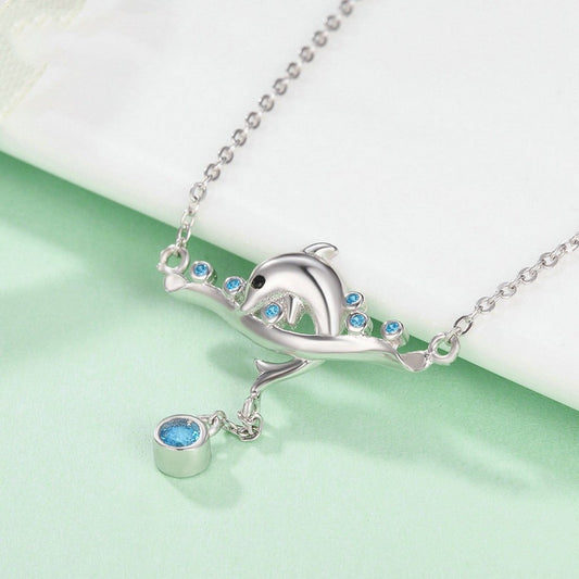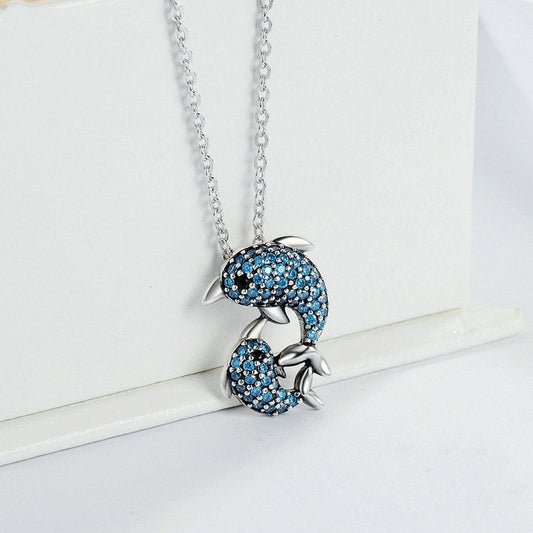 PAHALA 925 Sterling Silver Blue Crystals Dolphin Clear CZ Pendant Necklace