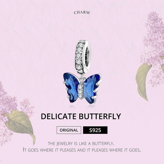PAHALA 925 Sterling Silver Blue Crystal Murano Delicate Butterfly Pendant Charm Bead