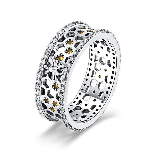 PAHALA 925 Strling Silver Trendy Bee Honeycomb Crystals Finger Weeding Party Ring