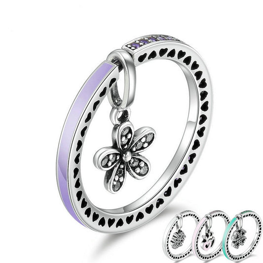 PAHALA 925 Sterling Silver Daisy Flower with Crystals Light Purple Enamel Vintage Wedding Engagement Band Ring