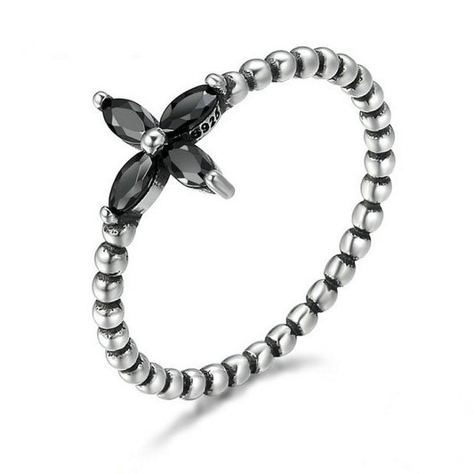 PAHALA 925 Sterling Silver Black Flower with Crystals Cubic Zirconia Vintage Wedding Engagement Band Ring