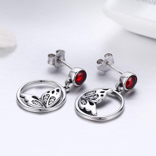 PAHALA 925 Sterling Silver Butterfly Feather Drop Red Crystal Earrings