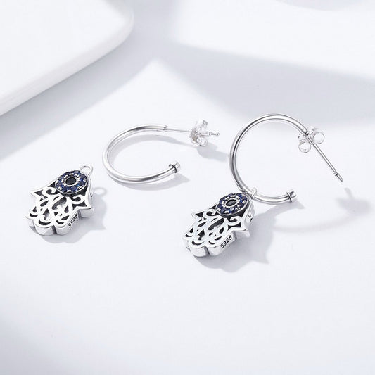 PAHALA 925 Sterling Silver Fantasy Hamsa Hand Blue With Crystals Stud Earrings
