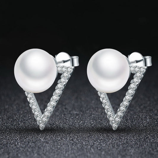 PAHALA 925 Sterling Silver Triangle Freshwater Pearl With Crystals Stud Earrings