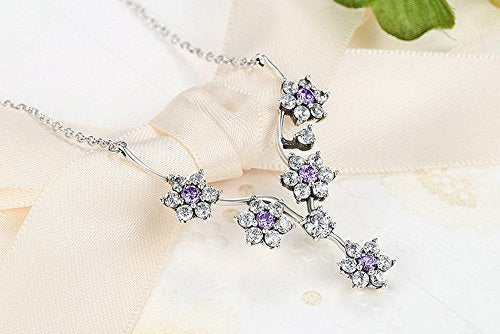PAHALA 925 Sterling Silver Purple Flowers Chain with Crystals Pendant Necklace