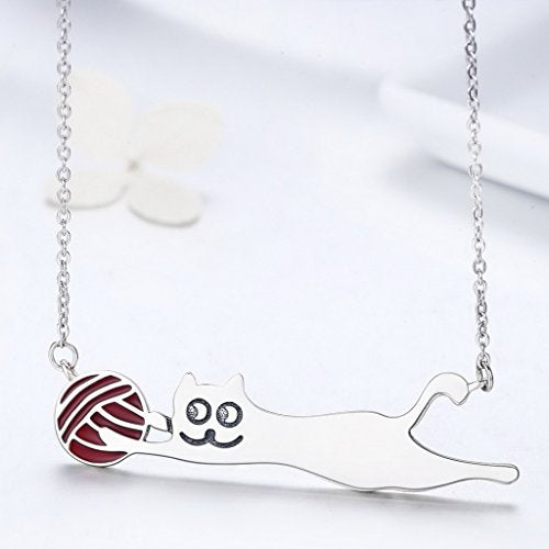 PAHALA 925 Sterling Silver Cat with Red Enamel Ball Clear CZ Pendant Necklace