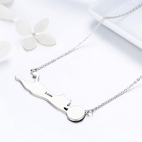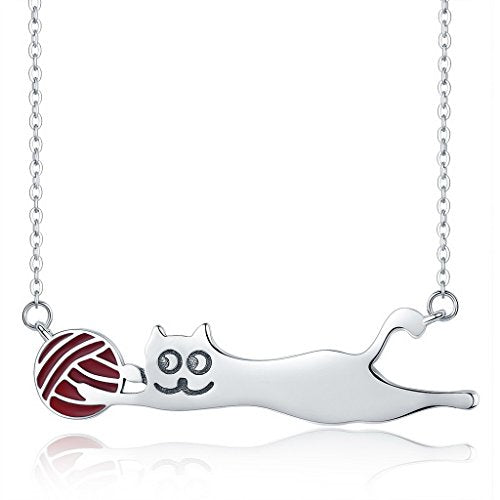 PAHALA 925 Sterling Silver Cat with Red Enamel Ball Clear CZ Pendant Necklace
