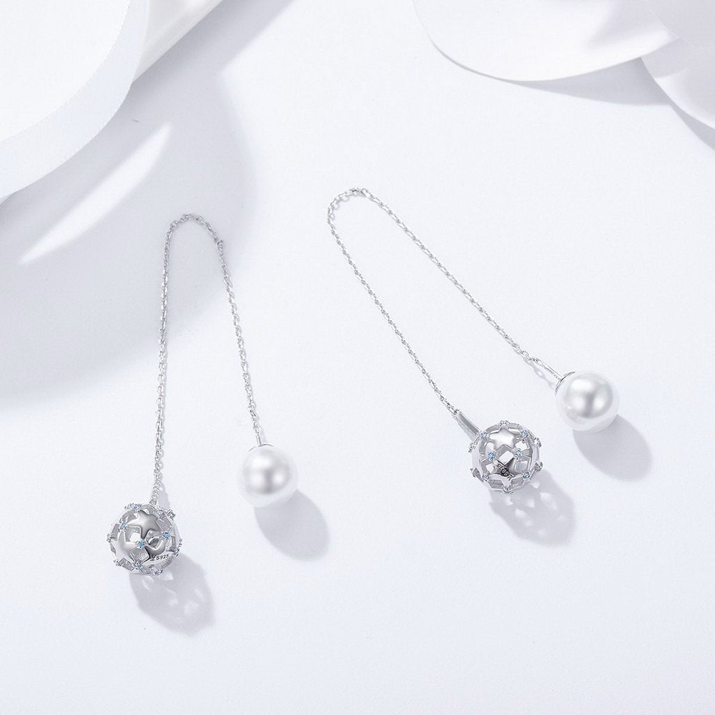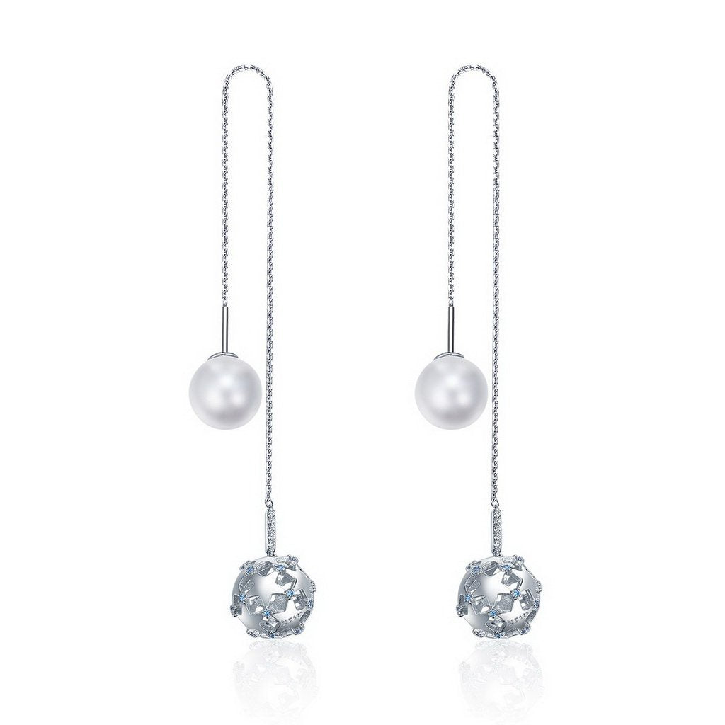 PAHALA 925 Sterling Silver Double Ball Luminous With Crystals Party Wedding Long Drop Earrings
