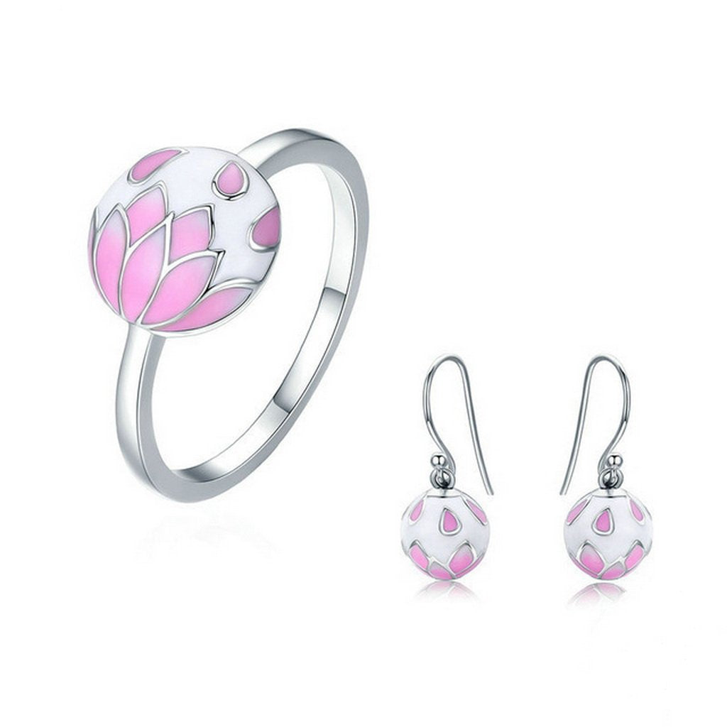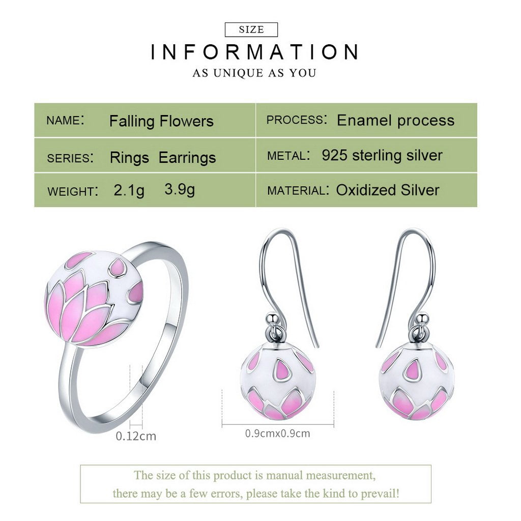 PAHALA 925 Sterling Silver Pink Enamel Flower Cherry Ring Earrings Jewelry Set